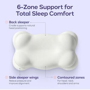Chiropractor approved cooling pillow. Cloud-like comfort in white. 6-Zone Comfort, Perfect Alignment. A patented ergonomic pillow with 6 sleep zones and dual-height support. Designed for side, back, and stomach sleepers.