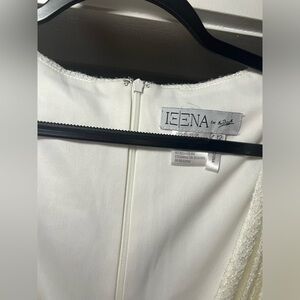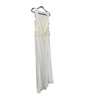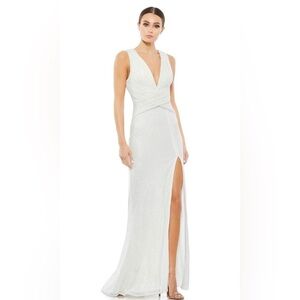 DESCRIPTION: Ieena for Mac Duggal. Gorgeous, stunning white long sleeveless gown with leg slit. Some threads are loose, easy repair by seamstress. No other callouts. Tags intact.