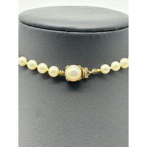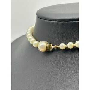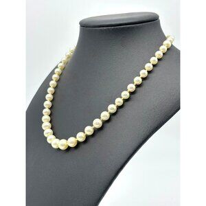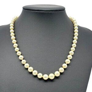 This beautiful faux graduated pearl necklace adds timeless elegance to any outfit. Creamy faux pearls range in size from 5mm to 8mm at the center, and the faux pearl in the prong set clasp is 10mm. Gold-tone metal at the clasp. This necklace is 16 inches long. Perfect for any occasion, from weddings to holiday parties, to lunch on the weekends. There is minor wear on some of the pearls and the clasp. 1960s/1970s.