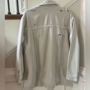 Stone/Tan soft distressed denim with vintage style buttons. Size small but typical FREE PEOPLE oversize so could also fit medium and possibly large.