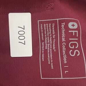 The product is a pair of FIGS men's scrub pants in size large, featuring a Cairo Cargo design in burgundy color. Made from a polyester blend material, these pants are specifically designed for the medical industry and are part of the Technical Collection. Manufactured in Vietnam, these solid-colored pants provide comfort and functionality for men working in a medical setting.