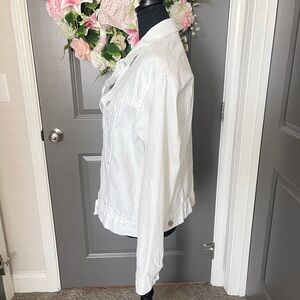 Classic white denim jacket. Button-front closure. Two chest pockets. Long sleeves. Non smoking environment. Rarely worn. Like new. Great for many occasions!