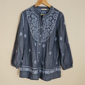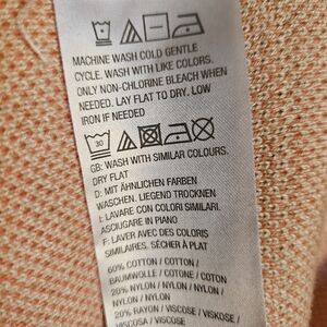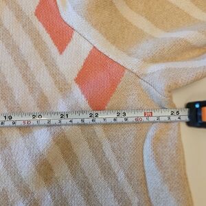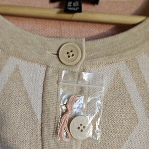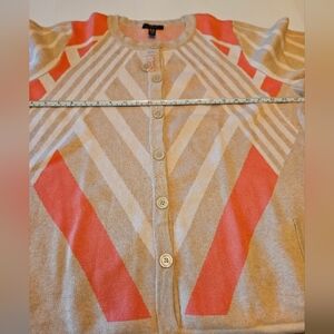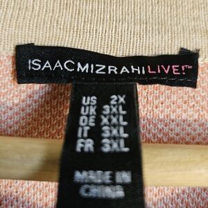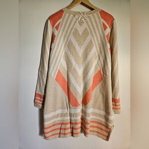 isaac mizrahi longline cotton/ nylon/ rayon blend women's size 2X button front cardigan. beautiful tan/ orange geometric design. 2 front pockets, side vents. has long sleeves. could be worn as sweater or shacket. new without tags. beautiful condition. machine wash cold gentle, dry flat.