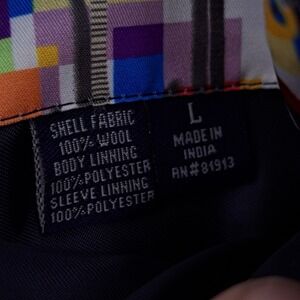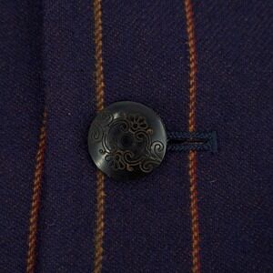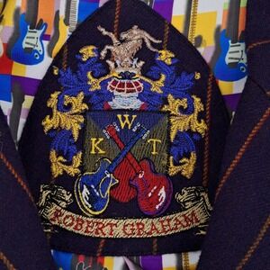 Robert Graham wool blazer showcases a sophisticated navy blue base with vibrant orange pinstripes, creating a bold yet classic aesthetic. The interior is a true conversation piece, featuring a full lining with a colorful electric guitar mosaic print and an embroidered crest at the inner neck. Designed with a three-button front closure, notched lapels, and functional patch pockets, this jacket blends traditional tailoring with the brand's signature eclectic flair. The ornate buttons on the cuffs and front add a final touch of detailed craftsmanship to this standout piece.