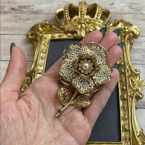 This exquisite brooch features a stunning gold flower design adorned with delicate pearls. Perfect for adding a touch of elegance to any outfit.