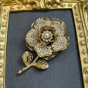 1950s vintage Oversized Coro flower brooch gold filigree petals with faux pearls