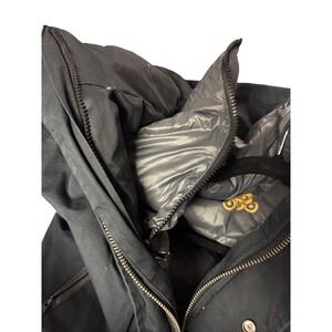 Heavyweight parka jacket features a durable outer shell with a zip and snap-button front closure. Equipped with a faux fur-trimmed hood and multiple utility pockets, including two slanted chest zip pockets and two large flap pockets at the waist. The interior is lined for added warmth, making it ideal for cold weather conditions. Adjustable drawstrings at the hood and a cinched back detail provide a customizable fit. Shows some light surface wear and lint consistent with gentle use.