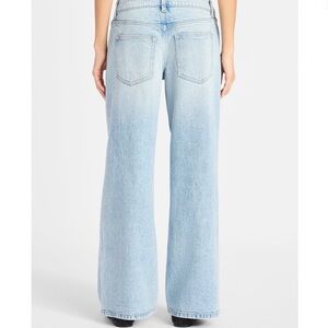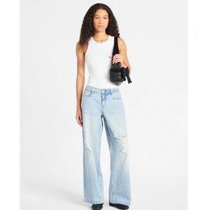 Features: Belt loops; wide leg; whiskering; distressed details on front