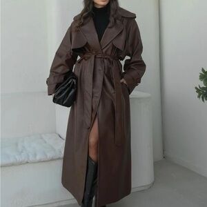 Sophisticated trench coat with a sleek design. Features a belted waist and buttoned cuffs. Ideal for stylish layering.
