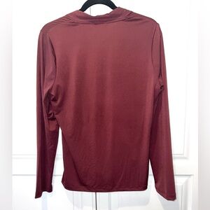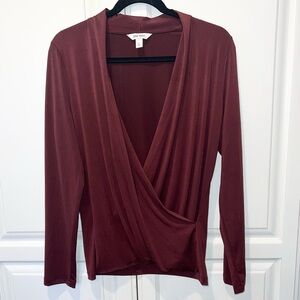 Nine West Burgundy Faux Wrap Blouse Deep V Neck Draped Top L