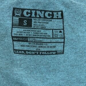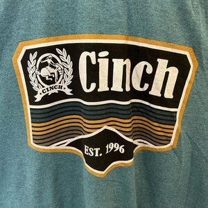 Stylish teal tee with bold Cinch logo. Comfortable and perfect for casual outings. Size small. Unisex