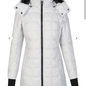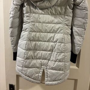 Worn maybe three times. Beautiful, silver color. Very warm, without being bulky. Size small. Will come with hanger and garment bag.