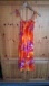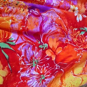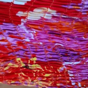 Great condition. Vibrant floral in red, coral, purple, green. Shirred elastic bodice, tie straps, knee length. Made in Hawaii. p2p 9.5in stretches to 17in. Length 34in. 100% rayon.