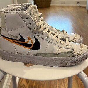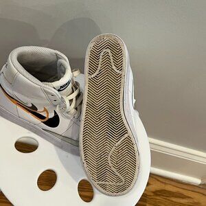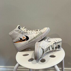 Nike Blazer Mid 77 sneakers bring a timeless retro vibe to any young athlete's wardrobe, featuring a crisp white leather upper with a dynamic multi-Swoosh design in black and orange. These high-top kicks offer excellent ankle support and a durable rubber outsole for reliable traction during all-day play. While showing some light signs of wear and minor creasing from previous adventures, they remain in good condition and ready for a new home. Perfect for school days, weekend outings, or casual skate sessions.