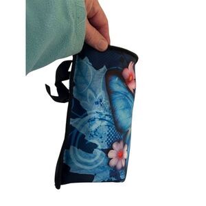 Keywords: lunch tote bag, insulated, spacious, butterfly print, floral design, blue tote, unisex baby, toddler bag, picnic bag, playdate accessory, durable, lightweight, convenient handles, pre-owned, stylish lunch bag.