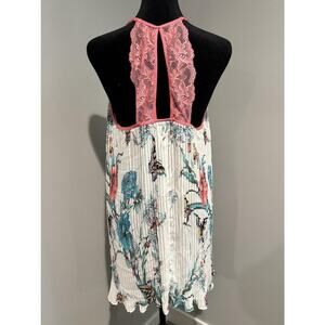 Pre-owned with light overall wear from prior use and some wrinkling from storage. Pleated chiffon body is clean and intact with no holes, pulls, or stains. Pink lace racerback, straps, and ruffled hem are secure with vibrant floral and butterfly print.