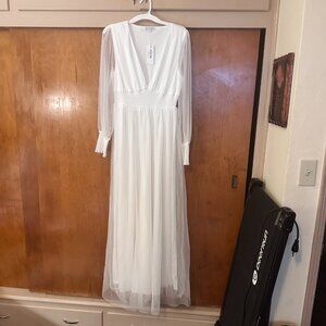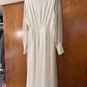 Shear white fancy dress. Never worn. Has tags. It is long. Good for renewal of vows or pictures.
