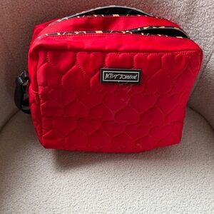A vibrant red quilted cosmetic bag featuring heart patterns, designed by Betsey Johnson. The bag includes multiple zippered compartments with a playful interior lining.