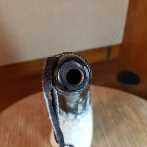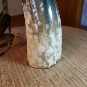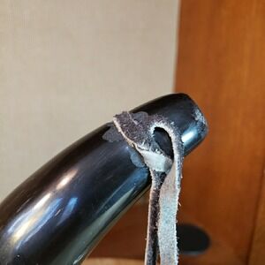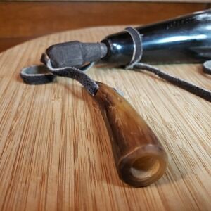 The product is a vintage 3-piece set that includes an 11" powder horn, measure, leather strap, and wood plug. Produced by Muzzle-Loaders, this set is designed for use with muzzleloaders, specifically originating from the United States. This item would be a valuable addition to any black powder hunting enthusiast's collection, offering both a traditional and functional piece for reloading purposes. The set is a classic and authentic representation of historical hunting practices.