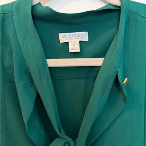 Chic teal blouse with button-down front. Features a stylish tie-neck detail. Perfect for versatile wear.