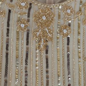 Chic champagne dress with intricate sequin detailing. Ideal for elegant events.