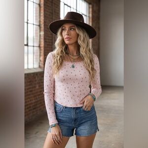 NWT Very J Teddy Bear Floral Print Long Sleeve Lace Neckline Top Shirt Pink