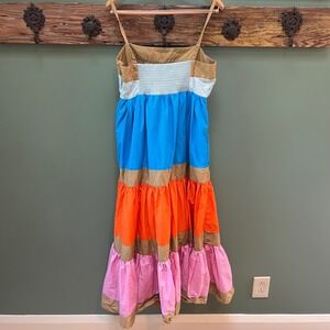 Eye-catching maxi dress that will brighten any occasion. This J. Crew dress features a smocked bodice, adjustable spaghetti straps, and a tiered skirt in shades of tan, blue, orange, and pink. The lightweight fabric makes it perfect for warm weather, and the flowy silhouette ensures a comfortable fit. This dress would be perfect for a summer wedding, a picnic in the park, or a casual day out with friends.