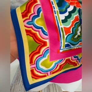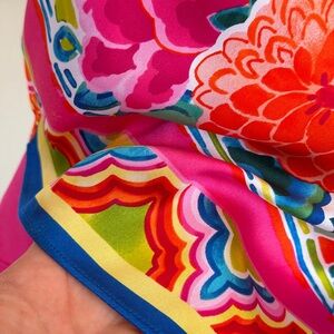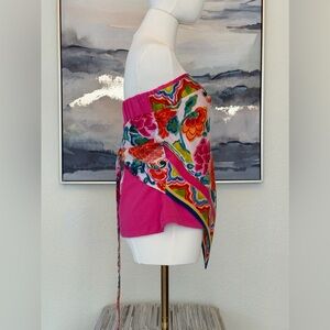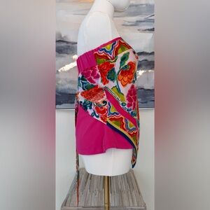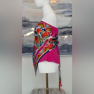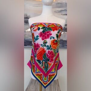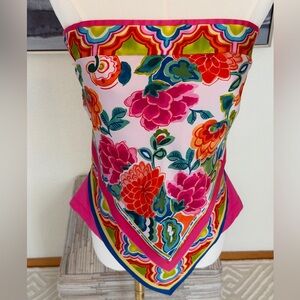Beautiful vintage-inspired strapless top by Caché featuring a vibrant floral scarf print in pink, yellow, and orange tones. Made with a luxurious 95%silk blend and a soft stretch lining for a comfortable, flattering fit. The handkerchief-style hem adds a fun, flowy detail that gives this piece a classic Y2K look.