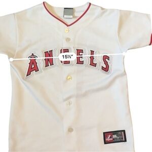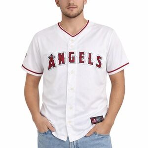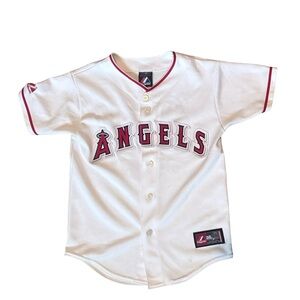 Classic Los Angeles Angels MLB baseball jersey by Majestic featuring the iconic red ANGELS lettering across the chest with halo “A” logo. Button front with red piping for an authentic on-field look. Perfect for game day, streetwear styling, or collectors of MLB fan gear.