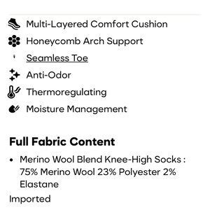 Warm and comfy Bombas Knee High socks in a mid-weight Merino Wool blend. (Refer to pictures to see exact fabric content). Colors are neutral: dark grey marl and light khaki tan. Brand new - never been worn or washed. Currently sold out on the Bombas website.