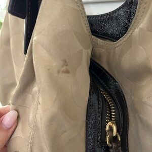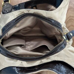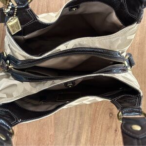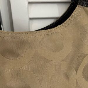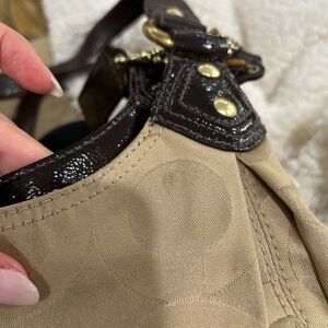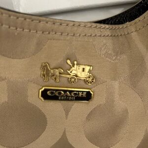 Stylish Coach shoulder bag in beige with dark brown accents. Features signature pattern and gold hardware. Perfect for everyday use.