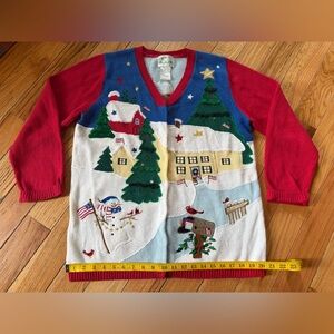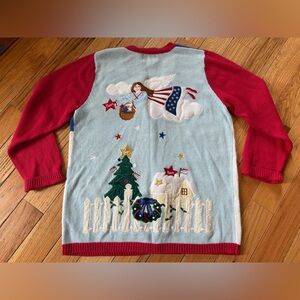 Vintage Quacker Factory women’s Christmas/Holiday button down cardigan sweater, size medium. Features gorgeous Americana/Patriotic Angel/Christmas Tree design. EUC. No rips, holes, stains or odors. Please see photos for item details/dimensions. Some photos may appear different in color due to lighting. Ships from smoke-free home.