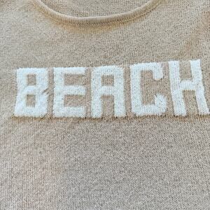 Relaxed lightweight knit top with woven BEACH graphic and soft neutral tone. Perfect for coastal outfits, casual lounge looks, or vacation layering.