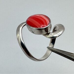 Vintage Mexico silver overlay statement ring featuring a beautiful oval red banded carnelian agate cabochon set in a bold modernist swirl design band. The striking red gemstone shows natural banding typical of banded agate / carnelian agate, giving the piece a unique artisan appearance.