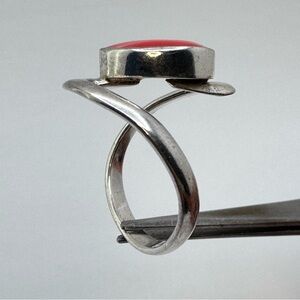 This ring has a sculptural mid-century modern / southwestern inspired style commonly associated with vintage Mexican jewelry design. The open swirl band frames the stone and creates a bold statement look perfect for collectors of artisan, boho, or southwestern jewelry.