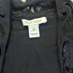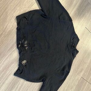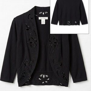 Chic black cardigan with floral cutout design. Ideal for layering. Adds elegance to any look.