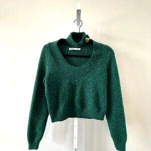 Trendy and fashion-forward Zara dark green sweater featuring a unique built-in choker neckline with buckle detail. This eye-catching design gives the look of a cutout neckline while keeping a sleek, modern silhouette. The cropped length and fitted shape make it perfect for styling with high-waisted denim or skirts.