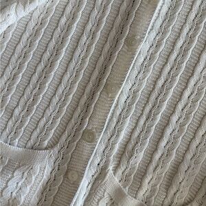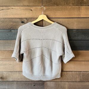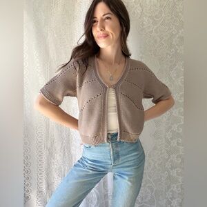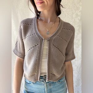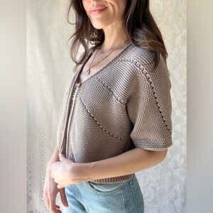 Soft neutral beige knit cardigan featuring a lightweight textured knit with subtle open stitch detailing throughout. Designed with a flattering cropped length, short sleeves, and front button closure.