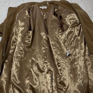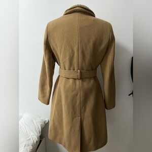 Chic camel trench coat with belted waist. Features stylish zipper details. Ideal for versatile wear.