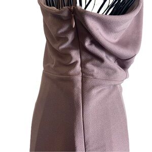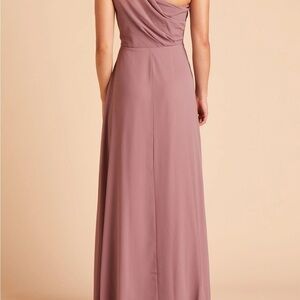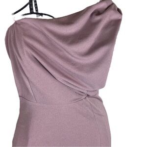 The **Birdy Grey Kira Dress** in **dark mauve** is a **one-shoulder chiffon maxi dress** with a Grecian-inspired silhouette. It features a softly draped **asymmetrical neckline**, **built-in bra cups** for extra support, and a **fitted waist** that accentuates the figure. The floor-length skirt flows elegantly, making it ideal for formal events or bridesmaid duties. The dress is also designed with **side pockets** for convenience.100% Polyester Dress. Dry clean. Women’s size medium. In excellent preowned condition.