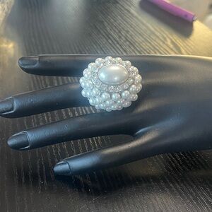 This stunning pearl cluster ring features a beautiful arrangement of white pearls, perfect for adding a touch of elegance to any outfit.