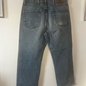 Wide-leg Wrangler jeans in a light blue denim. Soft faded wash for a relaxed look. High-rise waist and roomy leg for comfort. Pairs easily with casual tops.
