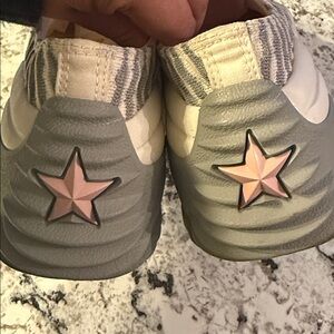 Step out in style with these chic cream and gray sneakers. Perfect for any casual outing, these shoes offer both comfort and a trendy look.