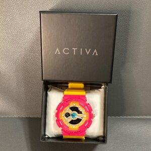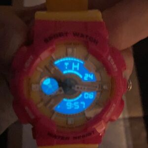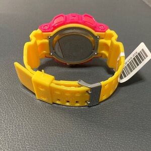 Vibrant pink and yellow sport watch.