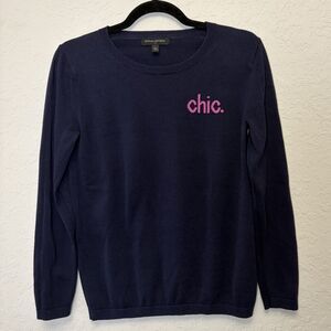 Super cute cotton crew neck lightweight sweater with fuchsia CHIC on left chest. Cotton/rayon blend.