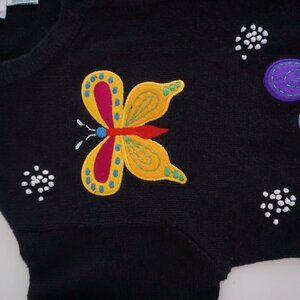 This vintage Quacker Factory cardigan is a true character piece, featuring colorful butterfly designs stitched across a black knit base. The butterflies are detailed with contrast thread and bright tones that stand out beautifully against the dark background, while small dotted embroidery throughout adds depth and texture. The overall look feels intentional and expressive, leaning into Grandmacore style that celebrates personality, nostalgia, and decorative knitwear without tipping into novelty territory.