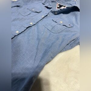 Casual light blue denim shirt by Tommy Hilfiger. Features button-up front and dual chest pockets.