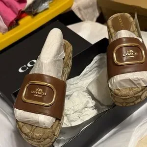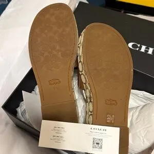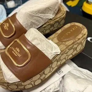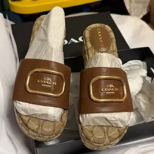 Msrp 228.00 Step out in style with these elegant Coach brown slide sandals. Perfect for any occasion, these shoes offer both comfort and sophistication.