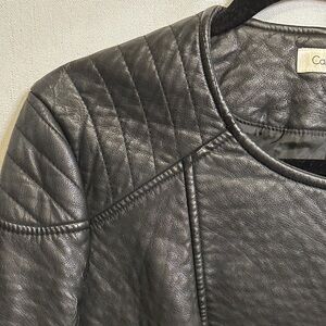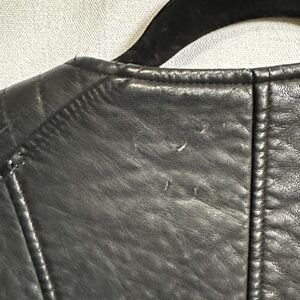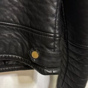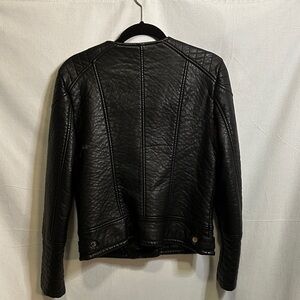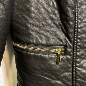 Stylish leather jacket with quilted accents. Features asymmetrical zipper and zippered pockets. Perfect for a modern look. Some damage to the leather on back left side (pictured).