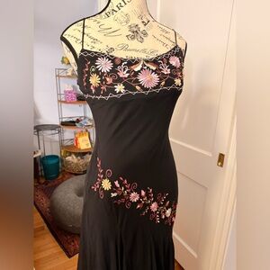 Beautiful Betsey Johnson New York 100% silk dress with delicate floral embroidery across the bust and skirt. Soft black silk with adjustable straps and a flowy handkerchief hem. My mother bought this for over $200 years ago.